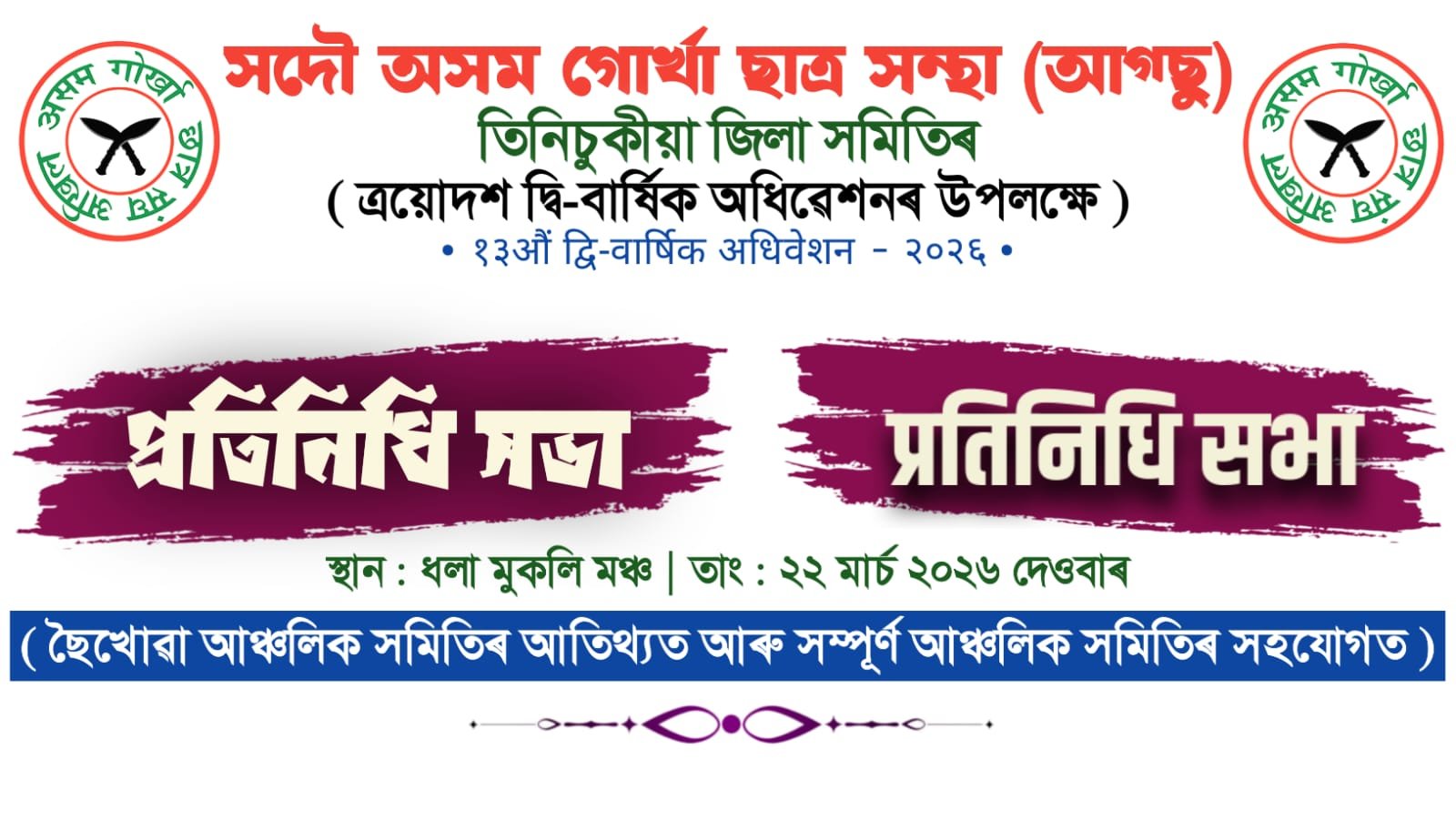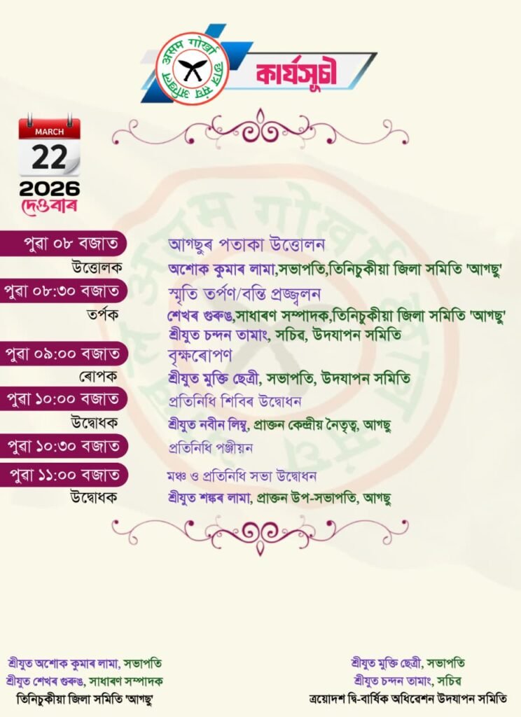 तीनसुकिया, १८ मार्च २०२६ः अखिल असम गोर्खा छात्र संघ (आग्सु) तीनसुकिया जिल्ला समितिको आयोजनामा सम्पन्न हुन गइरहेको त्रयोदश द्वि–वार्षिक अधिवेशनका लागि तयारी कार्य तीव्र पारिएको छ। यही २२ मार्च २०२६ आइतबारका दिन धला मुकलि मञ्च, छैखोवामा एकदिने कार्यक्रमको रूपमा आयोजना हुने उक्त अधिवेशन छैखोवा आञ्चलिक समितिको आतिथ्यतामा तथा सम्पूर्ण आञ्चलिक समितिहरूको सक्रिय सहयोगमा सम्पन्न हुनेछ।