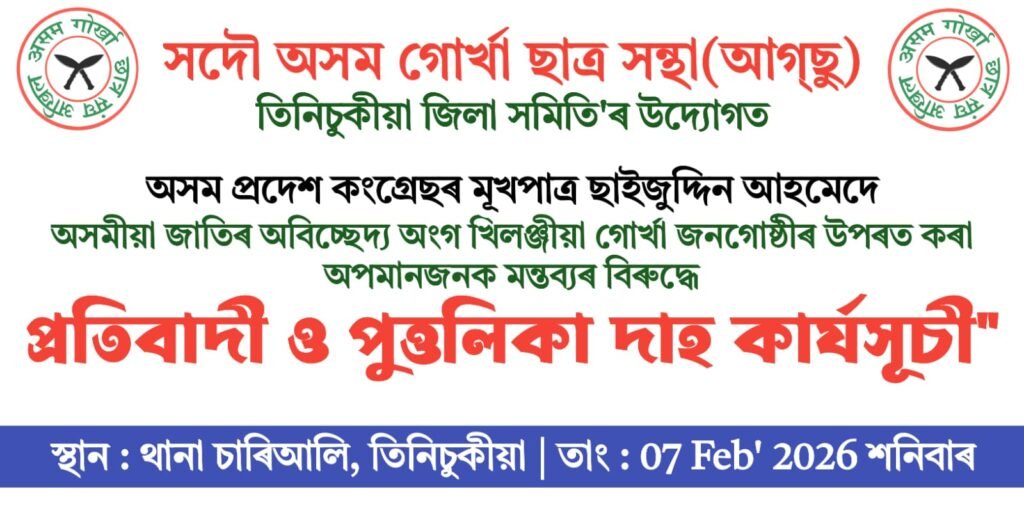 तिनसुकिया, ७ फेब्रुअरी २०२६: असम प्रदेशका मूखपात्र सेइज़उद्दिन अहमदले गोर्खा जनगोष्ठीमाथि अपमानजनक शब्द प्रयोग गरेको विरोधमा अखिल असम गोर्खा छात्र