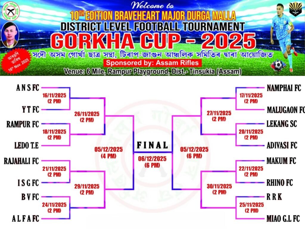 तिराप–जागुन, १६ नोभेम्बर : अखिल असम गोर्खा छात्र संघ तिराप–जागुन आञ्चलिक समितिको सैोजन्यमा तथा Assam Rifles को सक्रिय सहयोगमा इस पटकको 10th edition शहीद मेजर दुर्गा मल्ल जिल्ला स्तरीय फुटबल प्रतियोगिता आज आइतबारदेखि भव्य रूपमा शुभारम्भ भएको छ। प्रतियोगिताको उद्घाटन समारोहमा असम राइफल्सका मेजर अमित क्षेत्री, प्राक्तन् शिक्षक तथा प्रबुद्ध व्यक्तित्व मुकुट बरपात्र बर्गोहाइन ज्यू, स्थानीय गाउँबुढा, प्राक्तन् आग्सु कर्मी, अञ्चलका सम्मानित गणमान्य व्यक्तिहरू तथा जिल्ला समिति, आञ्चलिक समिति र शाखा समितिका पदाधिकारीहरूको उल्लेखनीय उपस्थिति जनाएको थियो।