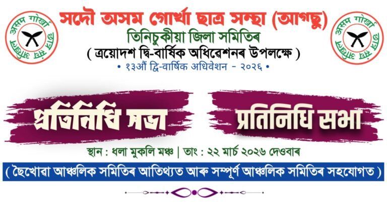 तीनसुकिया, १८ मार्च २०२६ः अखिल असम गोर्खा छात्र संघ (आग्सु) तीनसुकिया जिल्ला समितिको आयोजनामा सम्पन्न हुन गइरहेको त्रयोदश…