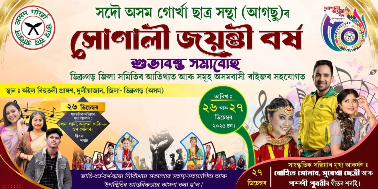 दुलीयाजान,बीहुतली २५दिसेम्वर: अखिल असम गोर्खा छात्र संघ (आग्सु) को स्वर्ण जयन्ती वर्षको शुभारम्भ समारोह आगामी २६ र २७ डिसेम्बर २०२५ का दिन दुईदिने भव्य तथा ऐतिहासिक कार्यक्रमको तयारी सम्पन्न भै सकेको छ । पाँच दशक लामो संगठनात्मक संघर्ष, उपलब्धि, त्याग र योगदानलाई स्मरण गर्दै आयोजना गरिने यस समारोहलाई गोर्खा समाजको ऐक्यबद्धता, आत्मसम्मान र भावी दिशानिर्देशनको महत्वपूर्ण मोडका रूपमा लिइएको छ। उक्त कार्यक्रममा असम तथा उत्तर–पूर्वाञ्चलका विभिन्न राज्यबाट करिब एक लाख गोर्खा जनताको सहभागिता रहने अनुमान गरिएको छ।