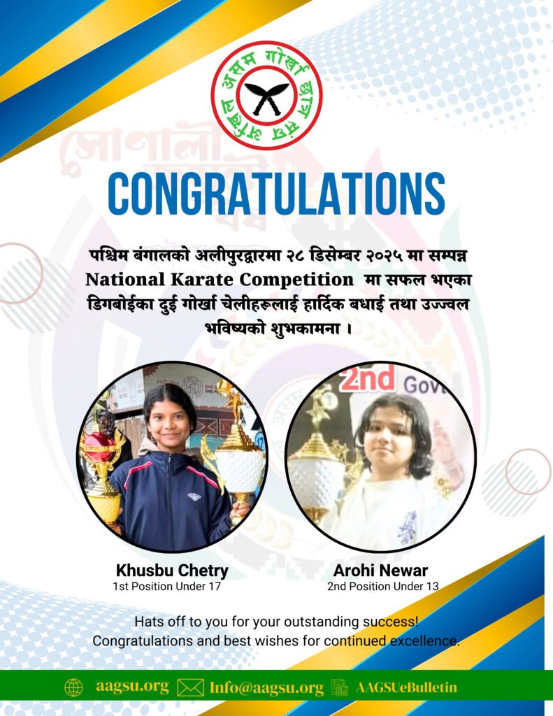 डिगबोई, ३० डिसेम्बर: पश्चिम बंगालको अलीपुरद्वारमा २६ डिसेम्बर २०२५ तारिखका दिन सम्पन्न राष्ट्रियस्तरको National Karate Competition मा असमको डिगबोई क्षेत्रका दुई गोर्खा चेलीहरूले उल्लेखनीय सफलता हासिल गर्दै सम्पूर्ण गोर्खा समुदायलाई गौरवान्वित बनाएका छन्। देशका विभिन्न राज्यबाट सहभागी सयौँ खेलाडीबीच भएको कडा प्रतिस्पर्धामा डिगबोईकी खुसबु छेत्री र आरोही नेवारले आफ्नो अद्भुत क्षमता, अनुशासन र आत्मविश्वासको परिचय दिँदै पदक जित्न सफल भएका हुन्।