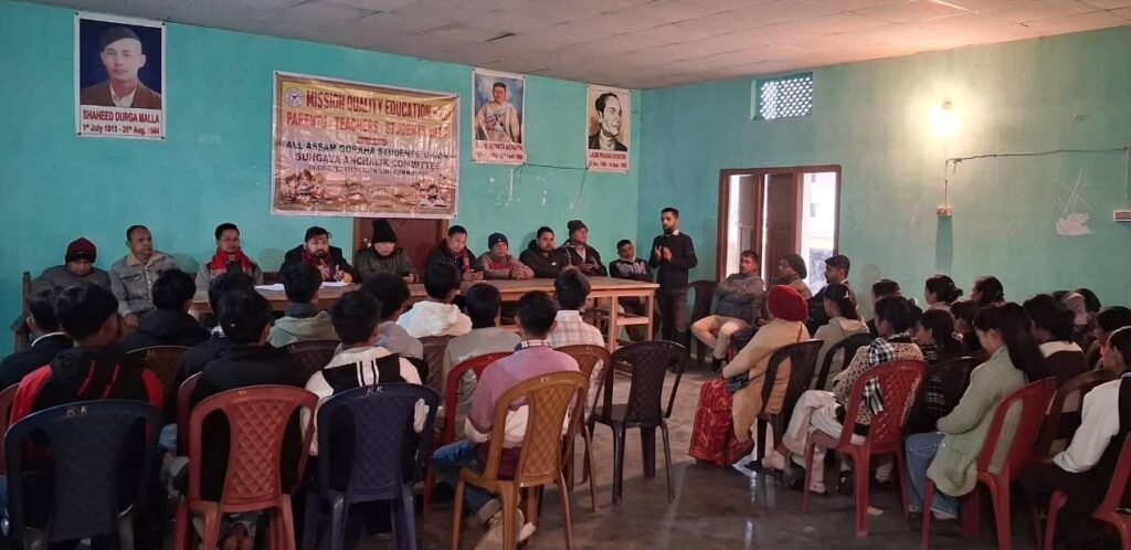 शान्तिपुर र राणिखाता 4 जनवारी: आगामी HSLC तथा HS परीक्षालाई दृष्टिगत गर्दै, चिराङ जिल्ला अन्तर्गत अखिल असम गोर्खा छात्र संघ (आग्सु), सुनगाभा आञ्चलिक समितिको उद्योग तथा शान्तिपुर, राणिखाता, गोरूभाषा, देउश्रि शाखा समितिको सहकार्यमा आज, मिति 04 जनवरी 2026 ई. (आइतबार), शान्तिपुर, राणिखाता, गोरूभाषा, देउश्रि शाखा समिति अन्तर्गतका HSLC तथा HS तहका विद्यार्थीहरू र उहाँहरूका अभिभावकहरूलाई समेट्दै “Mission Quality Education 2.0 (Parents–Teachers–Students Meet 2026)” शीर्षकमा एक शैक्षिक जागरूकता सभा सफलतापूर्वक सम्पन्न भएको छ।