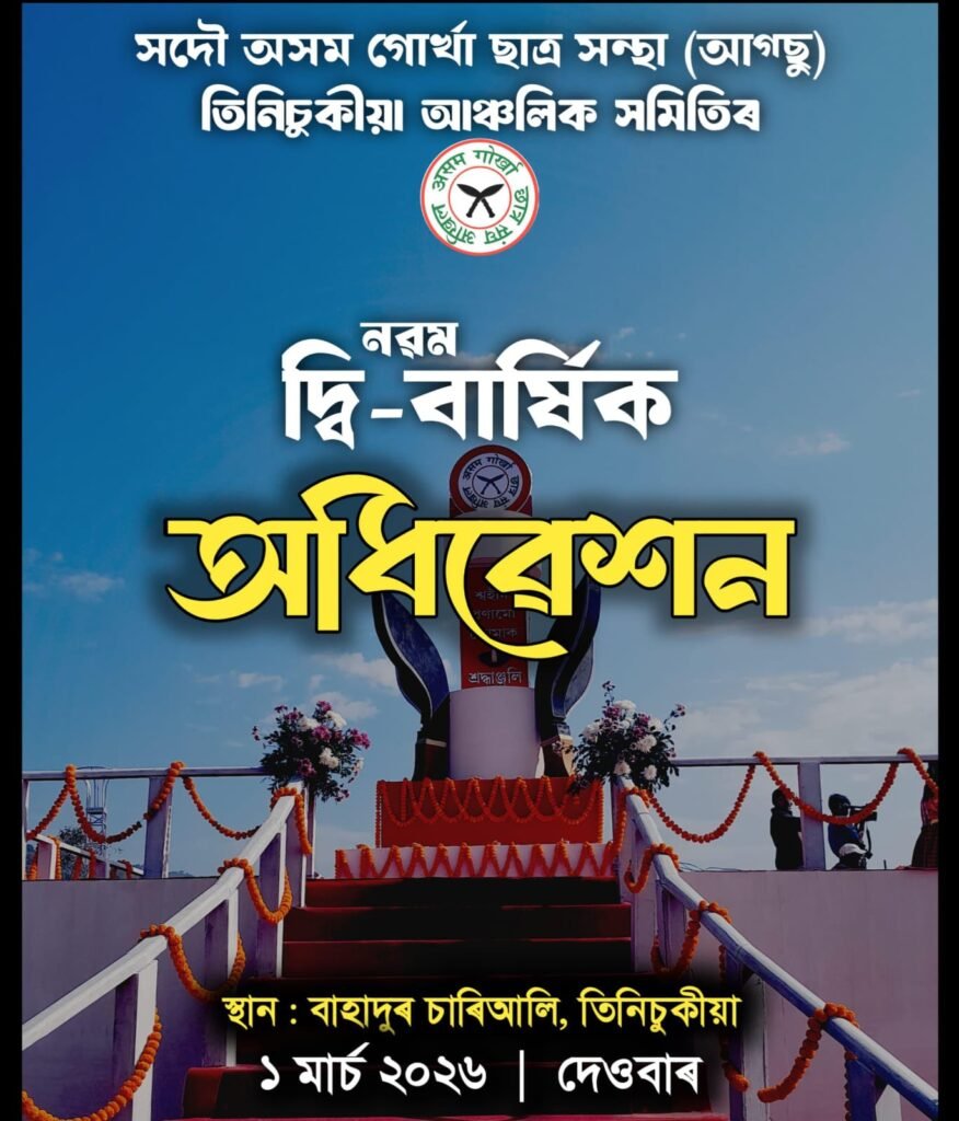​তিনিচুকীয়া, ১৮ ফেব্ৰুৱাৰী: অহা ১ মাৰ্চ, দেওবাৰে তিনিচুকীয়া জিলাৰ অন্তৰ্গত বাহাদুৰ চাৰিআলিত সদৌ অসম গোর্খা ছাত্ৰ সন্থা (আগ্ছু)ৰ তিনিচুকীয়া আঞ্চলিক সমিতিৰ দ্বি-বার্ষিক অধিৱেশনখনি বৰ্ণাঢ্য কাৰ্যসূচীৰে অনুষ্ঠিত কৰাৰ ব্যাপক প্ৰস্তুতি চলিছে। অধিৱেশনৰ অভ্যৰ্থনা সমিতিয়ে জনোৱা মতে, সেইদিনা পুৱা সংগঠনৰ পতাকা উত্তোলনৰ পাছতেই এক গাম্ভীৰ্যপূৰ্ণ শ্রদ্ধাঞ্জলি অনুষ্ঠান অনুষ্ঠিত হ’ব। এই অনুষ্ঠানত অঞ্চলটোৰ বিভিন্ন ক্ষেত্ৰৰ বিশিষ্ট ব্যক্তি তথা সমাজৰ হকে ত্যাগ স্বীকাৰ কৰা মহান ব্যক্তিসকলক শ্ৰদ্ধাৰে সোঁৱৰণ কৰা হ’ব।